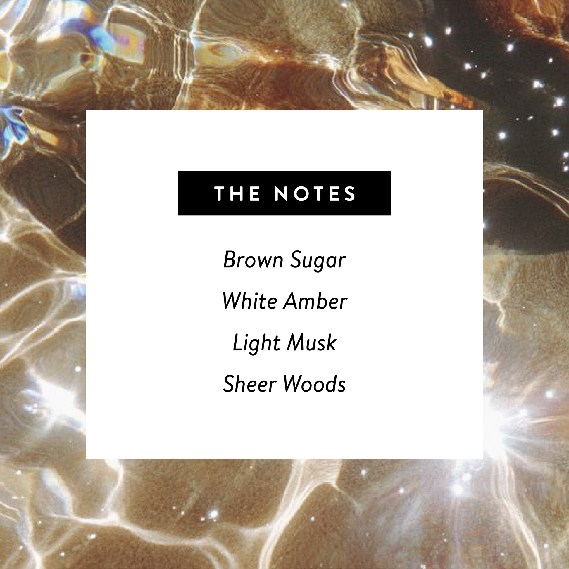 Notes: Brown Sugar, White Amber, Light Musk, Sheer Woods